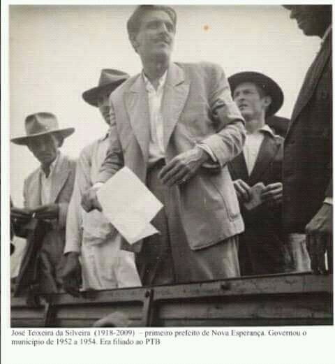 Primeiro prefeito de Nova EsperançaDepartamento de Culturadezembro 16, 2025 Documento Coleção Arquivos Casa Da Cultura 2 (Arquivo Virtual) (186) Baixar IdentificaçãoTítuloPrimeiro prefeito de Nova EsperançaDescriçãoJosé Teixeira da Silveira (1918-2009) - Primeiro prefeito de Nova Esperança. Governou o município de 1952 e 1954. Era filiado ao PTBClassificaçãoFoto de Grupos